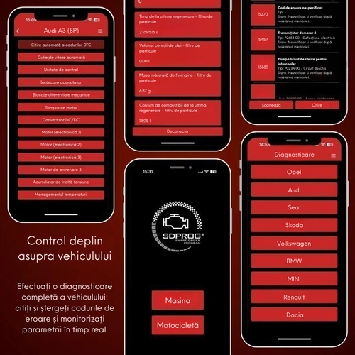 Un set complet pentru diagnoza vehiculelor, care combină interfața modernă SDPROG OBD cu software-ul avansat SDPROG.